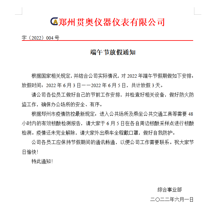 鄭州貫奧儀器儀表2022年端午節放假通知