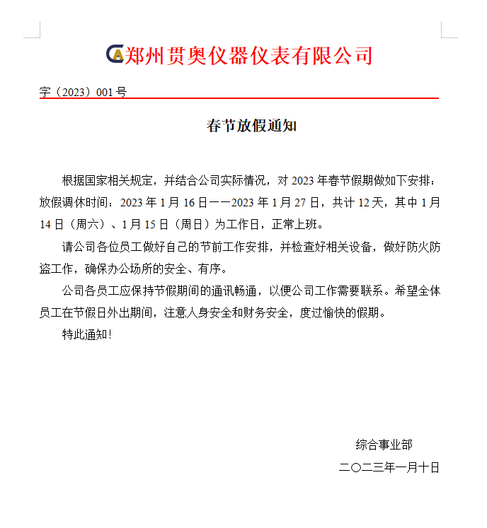 在此,感謝大家在過去一年里對鄭州貫奧儀器儀表有限公司的支持與信任。同時也希望在新的一年里,鄭州貫奧儀器儀表有限公司能繼續得到大家的關注及支持,并且鄭州貫奧儀器儀表有限公司也會一如既往地為大家提供更好的產品和服務!